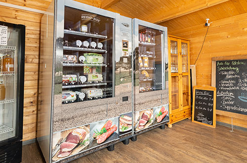 Selbsterzeugte und regionale Produkte wie z.B. Eier, Wurst und Schmalz, Honig und Marmeladen, Kartoffeln, Nudeln und Getränke. Weiterhin heimisches Holz, Getreide und Stroh sowie frische Enten und Gänse aus Freilandhaltung.