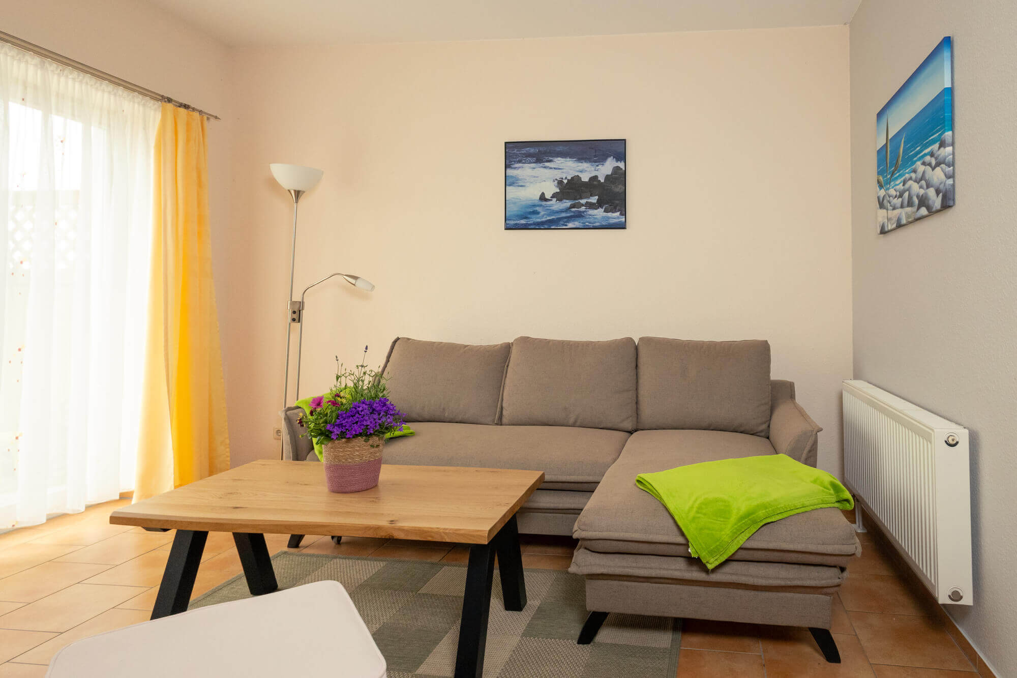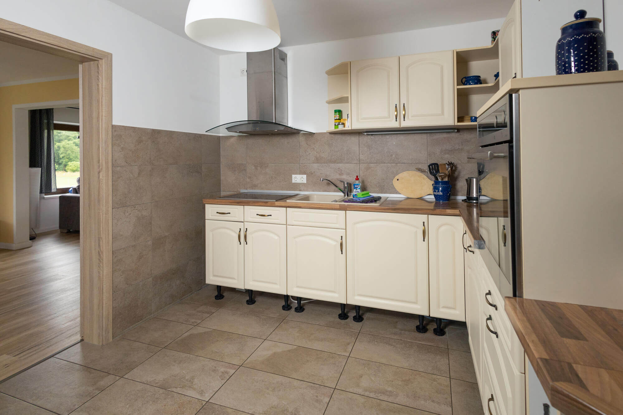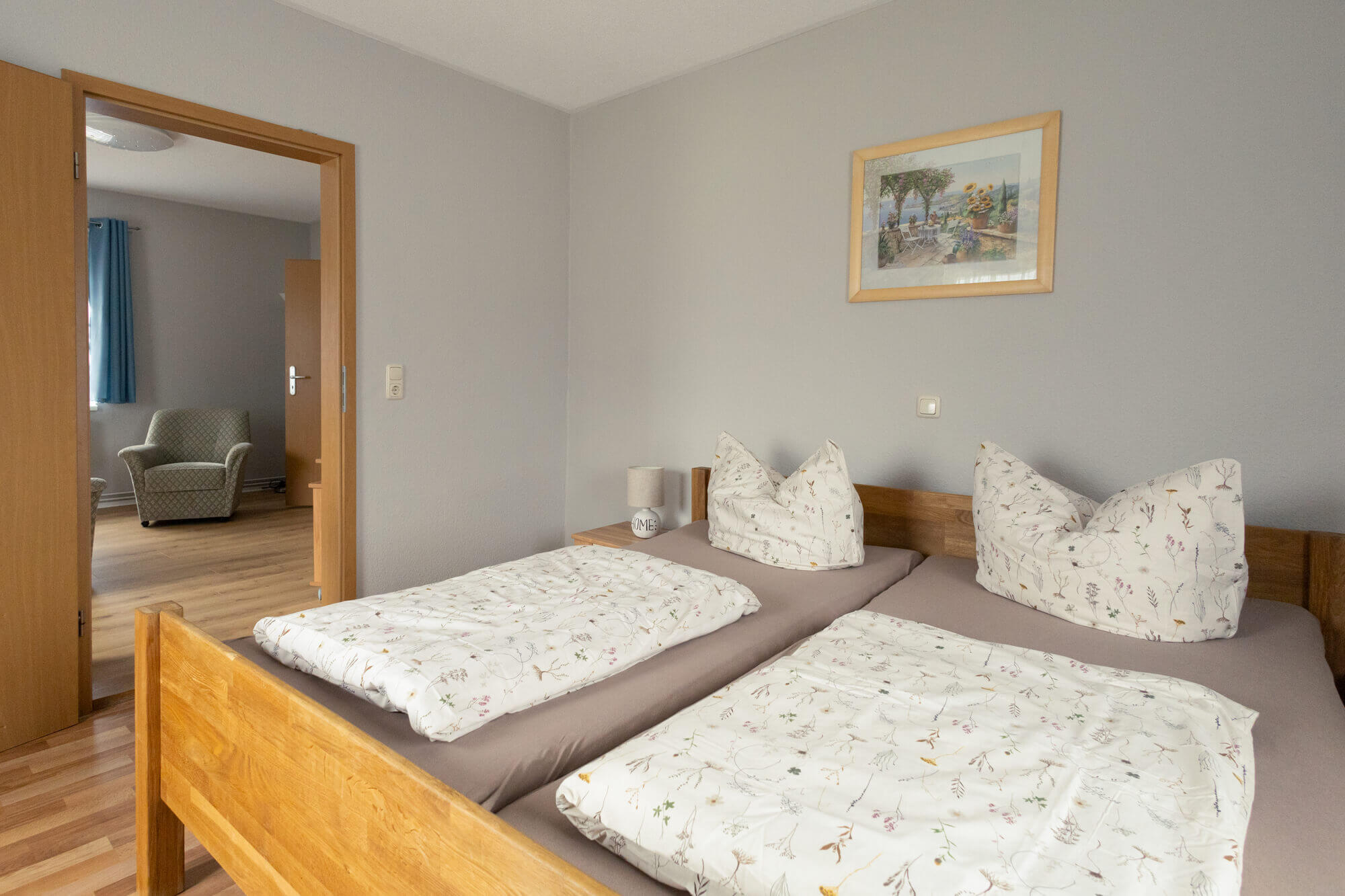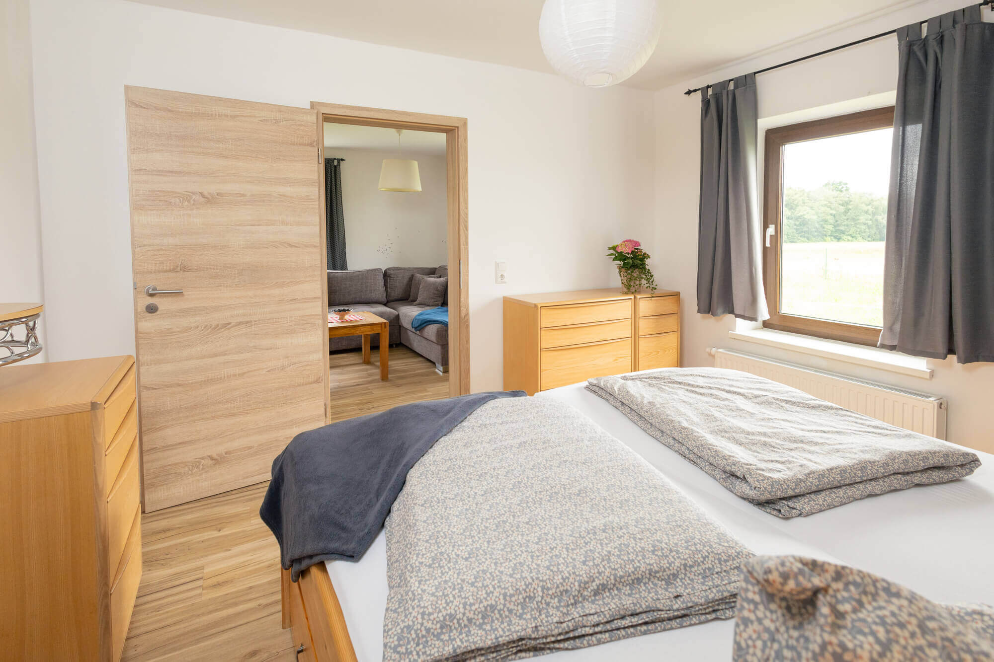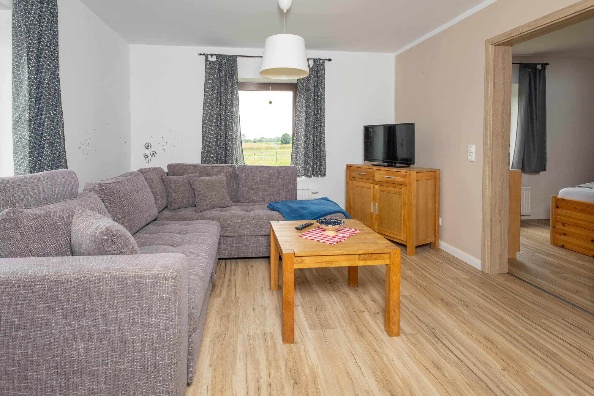 Durchbruch zum Wohnzimmer mit Eckcouch - 2 Schlafzimmer mit Doppelbett, 1 Schlafzimmer mit 2 Einzelbetten