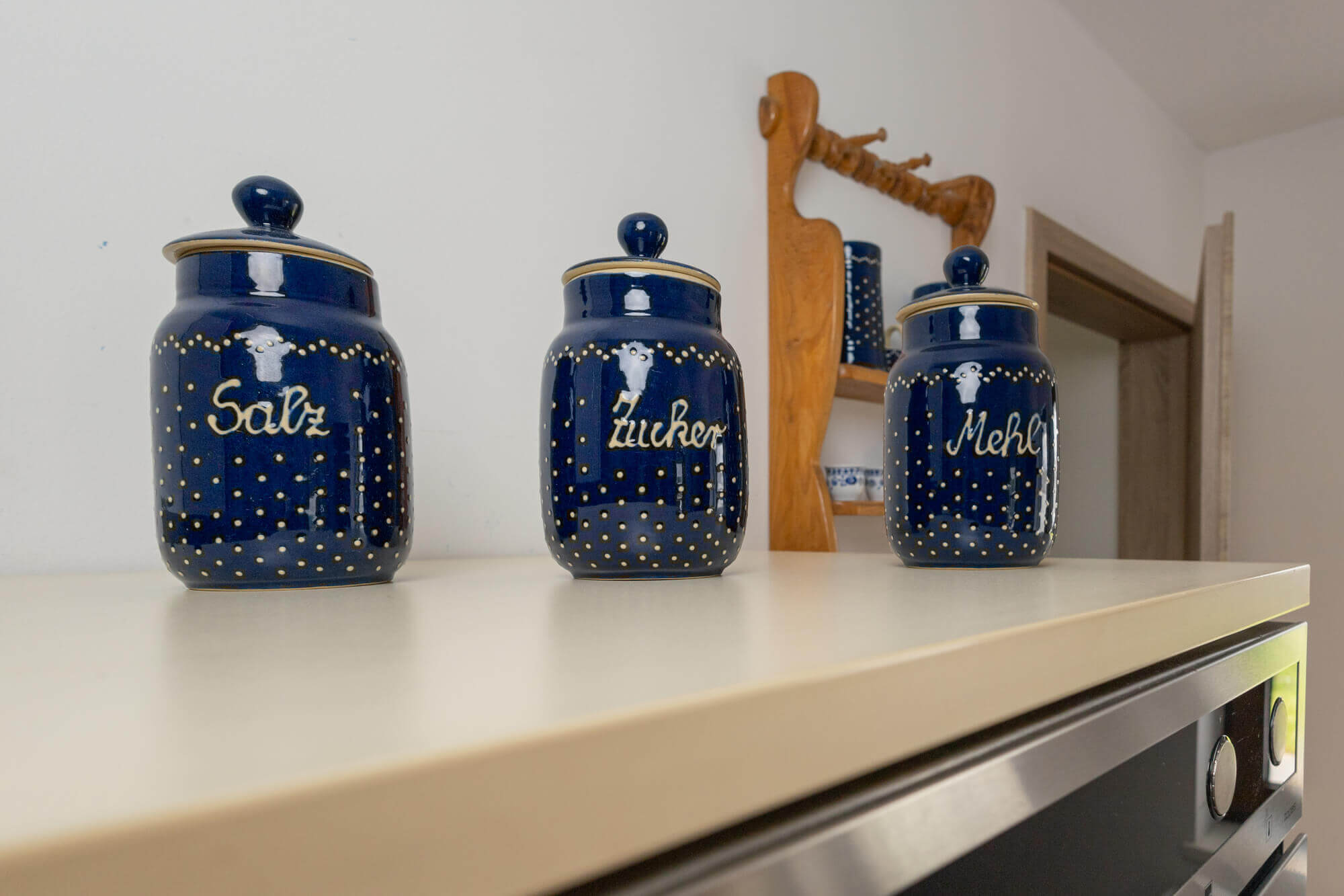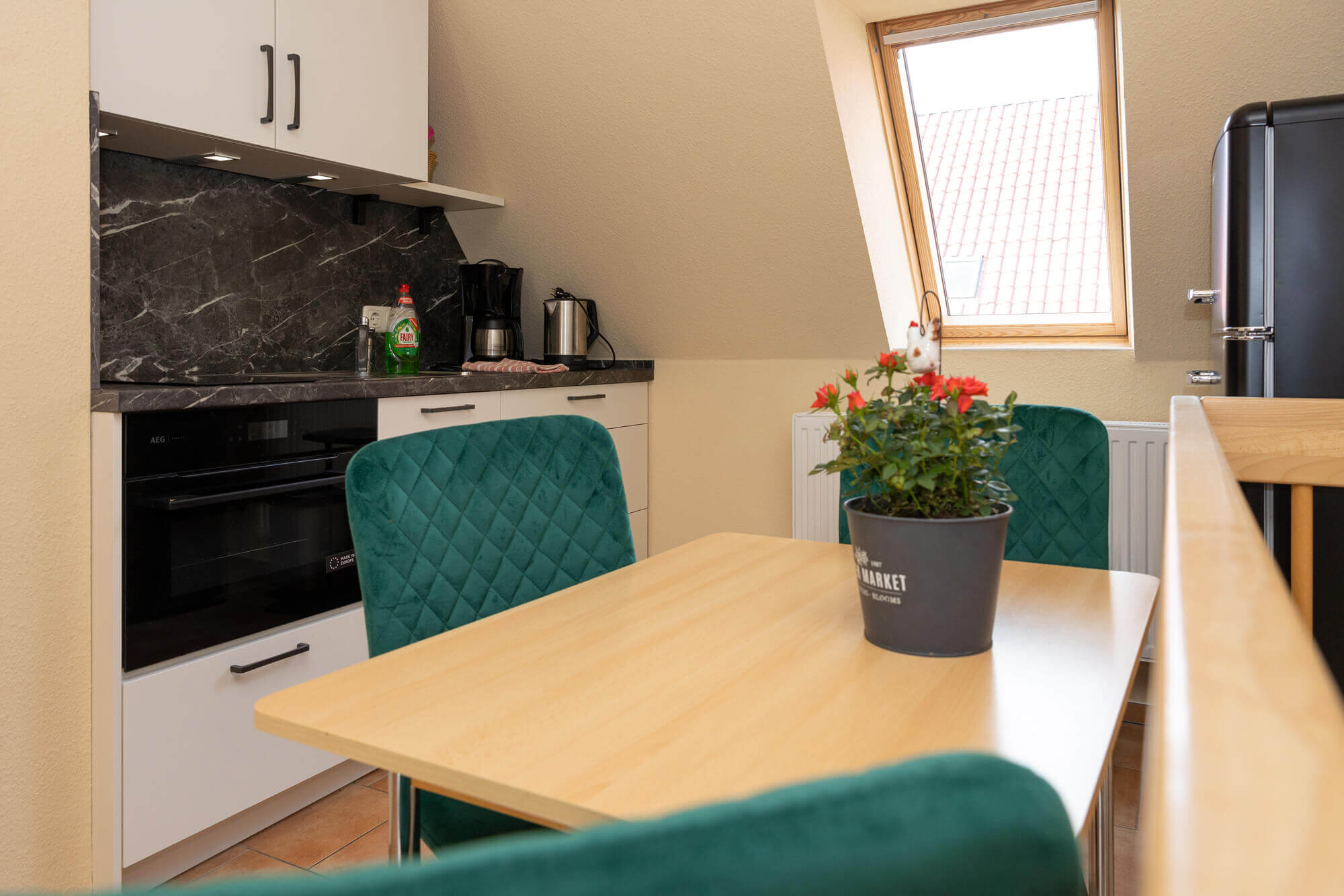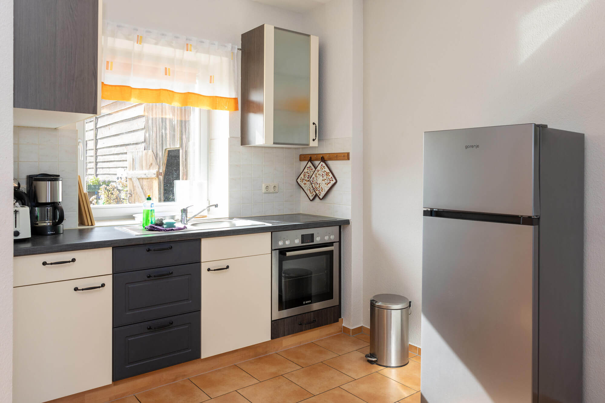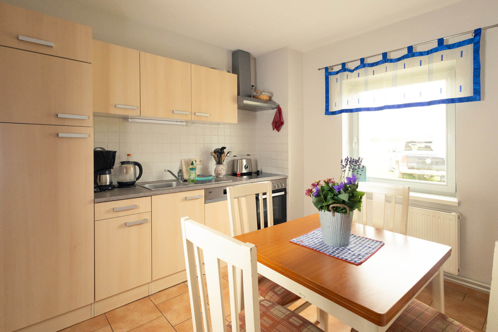 - Küche mit E-Herd, Kaffeemaschine, Toaster & Wasserkocher