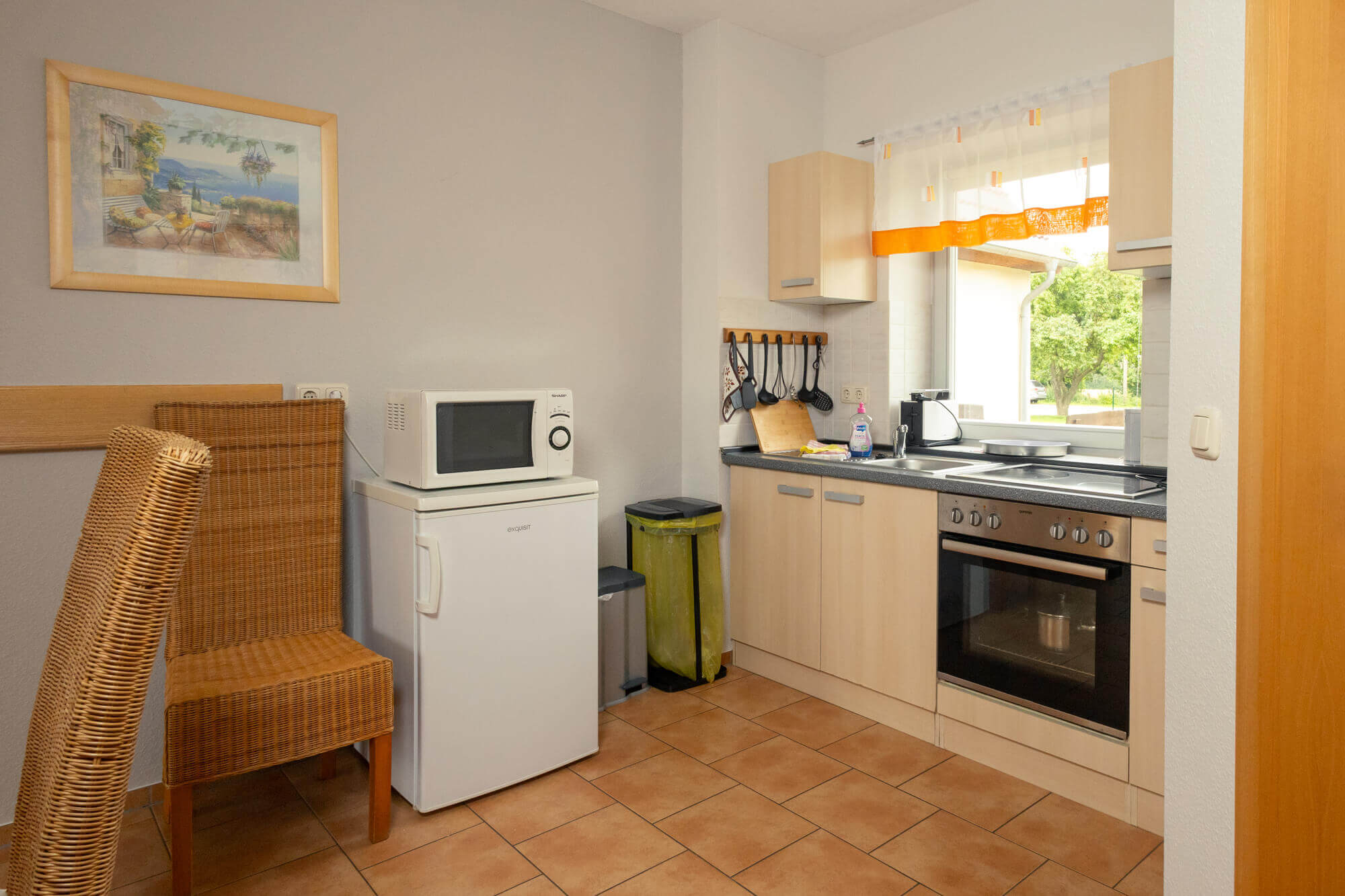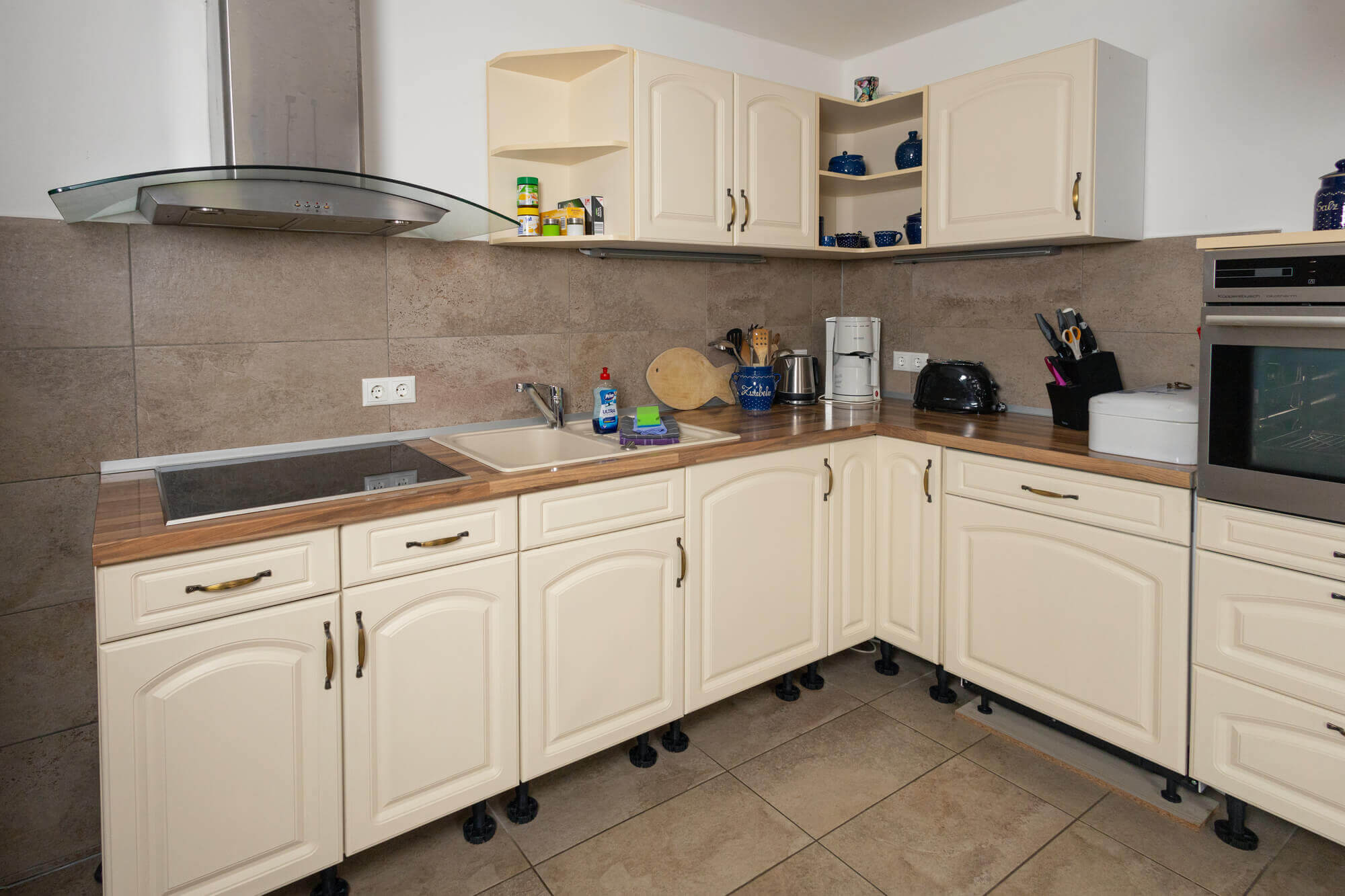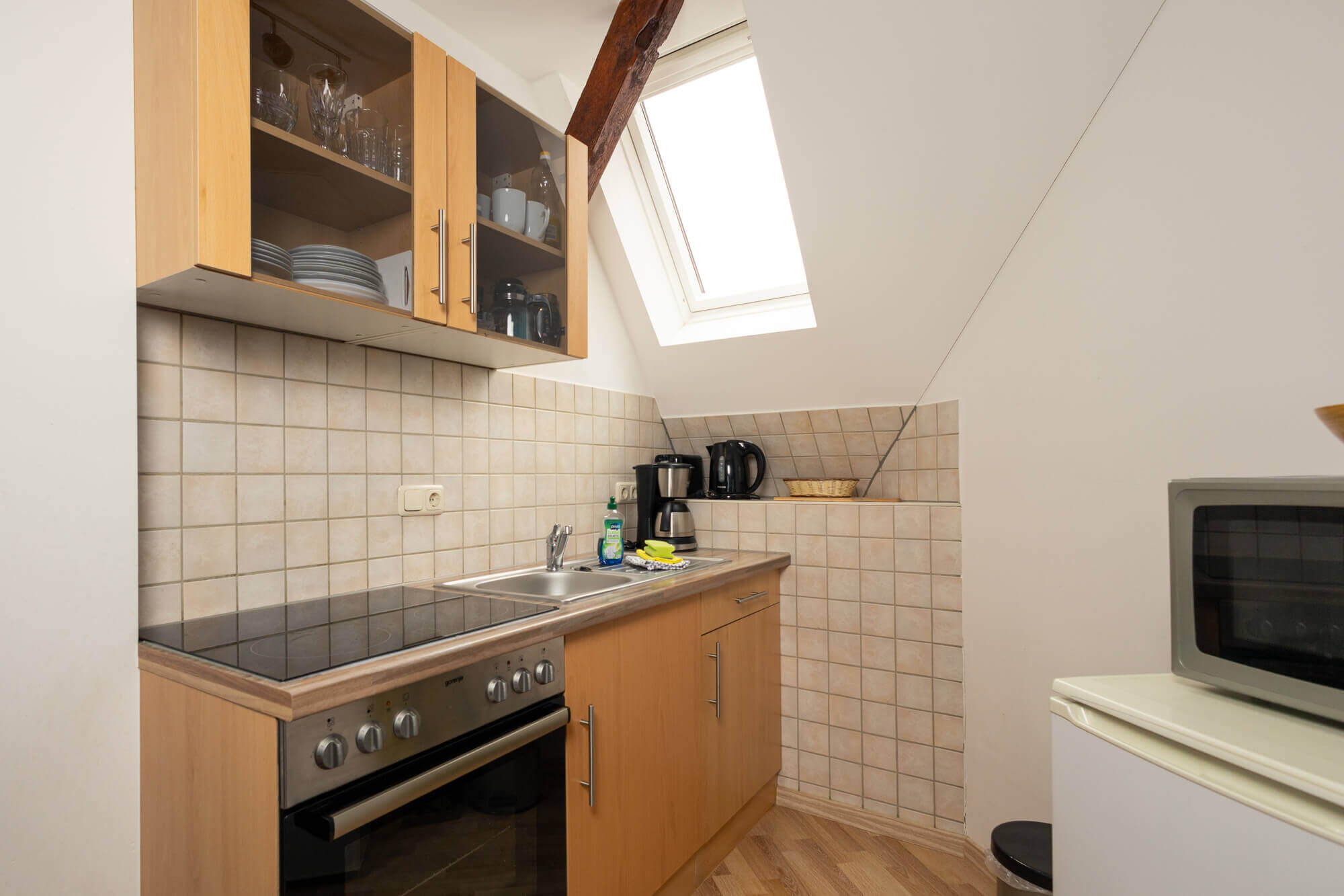 - Küche mit E-Herd, Mikrowelle, Kaffeemaschine, Toaster & Wasserkocher